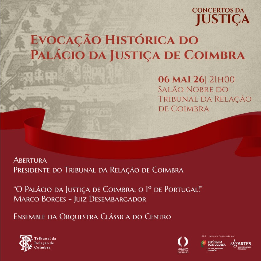 • Concertos da Justiça – Evocação História do Palácio da Justiça de Coimbra – Salão Nobre, dia 6 de maio de 2026, às 21 horas.